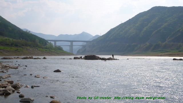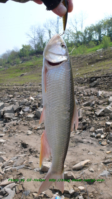 私は岩場は諦めていち早く下流へ下流へ・・・「ソガリ」は確実に瀬に入っていると思いました。一番良さそうな場所は午後に皆で狙う事にして、もっと下流の流れの強い所まで移動しました。瀬の中にルアーを投げてみると、出て来るのは皆「ハス」でした。