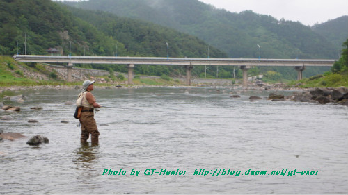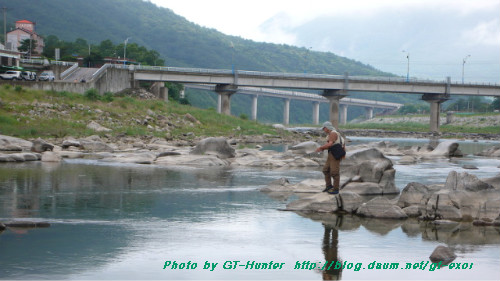 ポイントに到着すると雨が降り始めました。それに最悪のケースだと言うか・・・地元のおじいさんが一人、ハンマーを持って川の岩を叩いているんじゃないですか。岩の下に潜んでいる魚を気絶させる非常に原始的な漁を何でここで・・・。